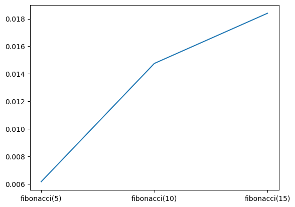 plt.xticks([0, 1, 2], ['fibonacci(5)', 'fibonacci(10)', 'fibonacci(15)'])
